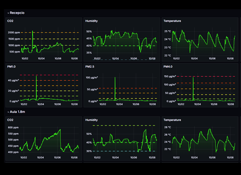 Per fer un pas més en l’avaluació i millora dels edificis de fusta, hem incorporat una xarxa de sensors que permeten monitorar en temps real la qualitat ambiental interior i exterior i el comportament dels elements constructius de fusta. Aquests dispositius mesuren paràmetres com el diòxid de carboni (CO₂), els compostos orgànics volàtils (VOC), la temperatura, la humitat relativa, les partícules en suspensió (PM2.5) i els òxids de nitrogen (NOx).